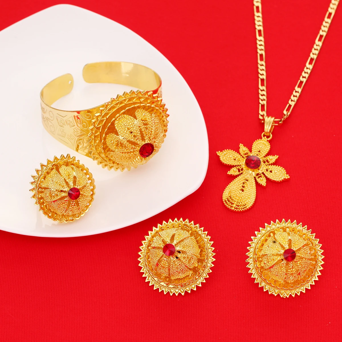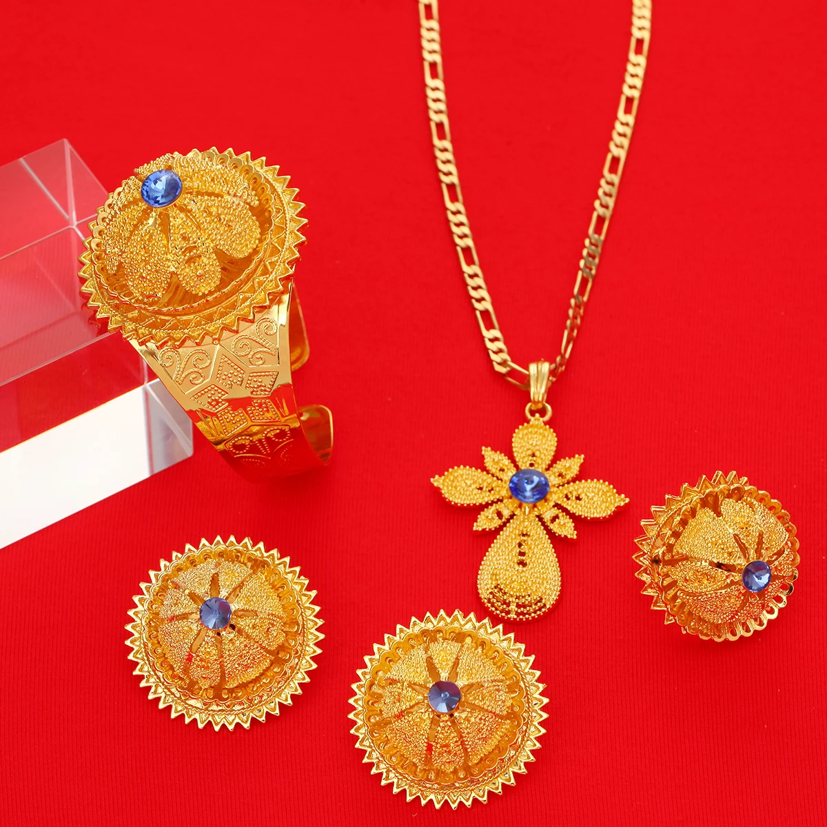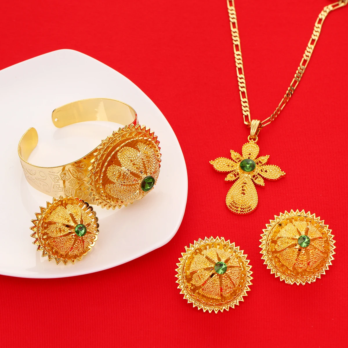 Gold Color Ethiopian Jewelry Red Blue Green Stone Habesha Women Bride Wedding Jewelry Set